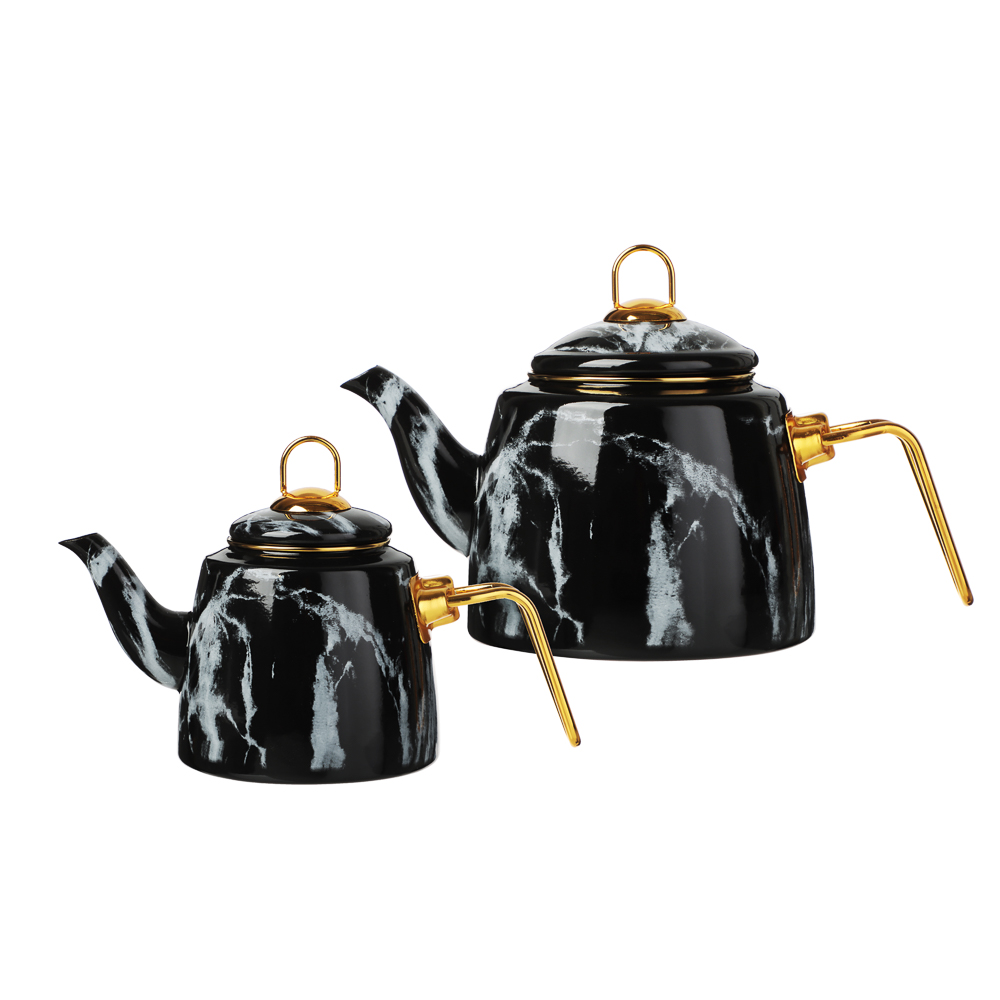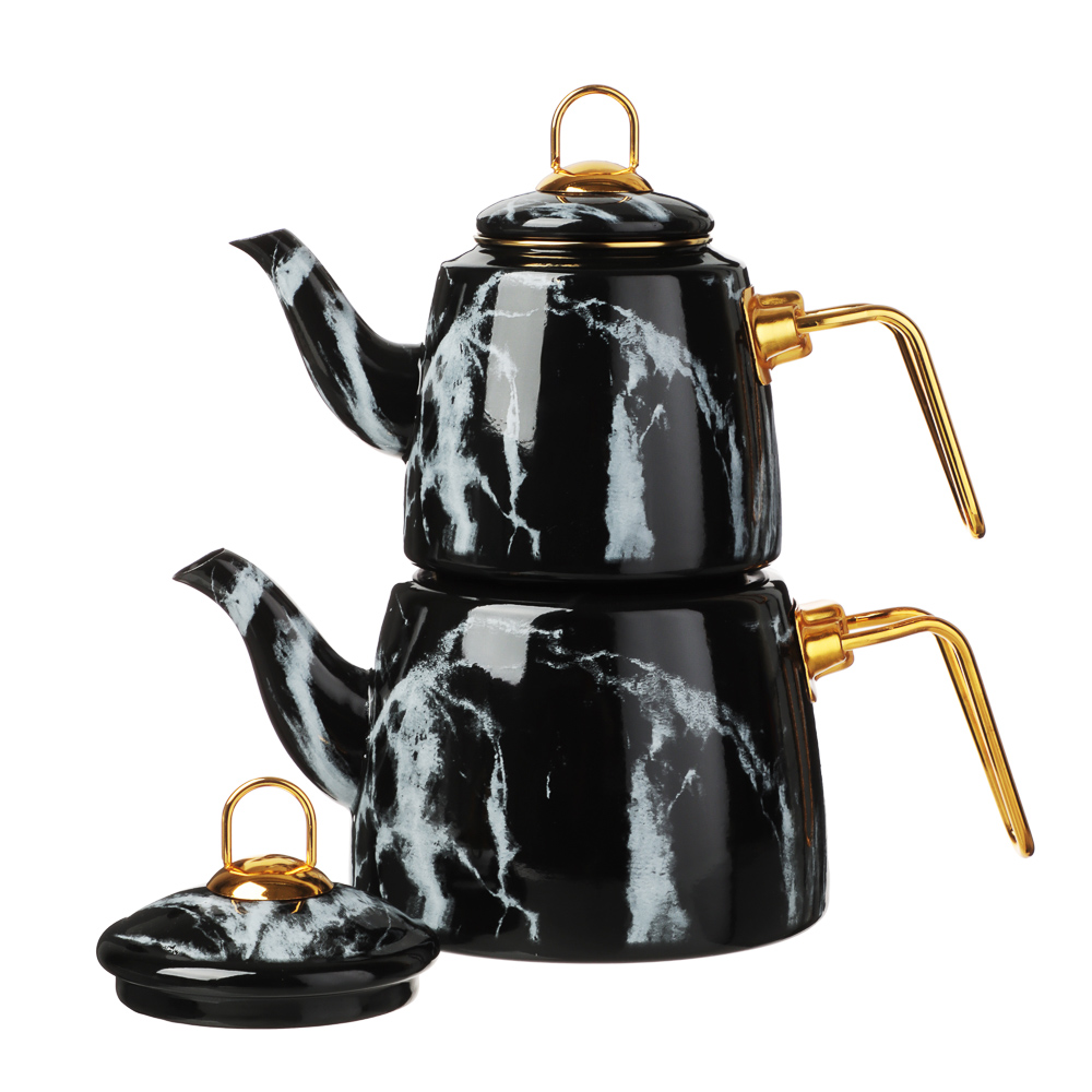 объема позволит организовать эффектную подачу любимого напитка и превратит чаепитие в особый ритуал. Благодаря необычному способу приготовления чайный лист постепенно раскрывает свой вкус и аромат, напиток получается насыщенным и бодрящим. Чайник имеет стильный дизайн с поверхностью под мрамор и ручками золотого цвета, смотрится выразительно и привлекает всеобщее внимание. Эмаль не вступает в контакт с напитком и не изменяет его вкус. Подходит для всех типов плит, включая индукцию. Подробная инструкция по приготовлению чая представлена на упаковке.